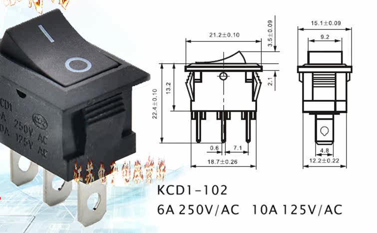KCD1-102 teething switch wane switch single-pole power switch 6A black 3 foot 2 gear button switch