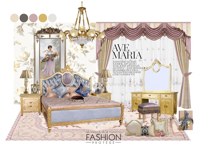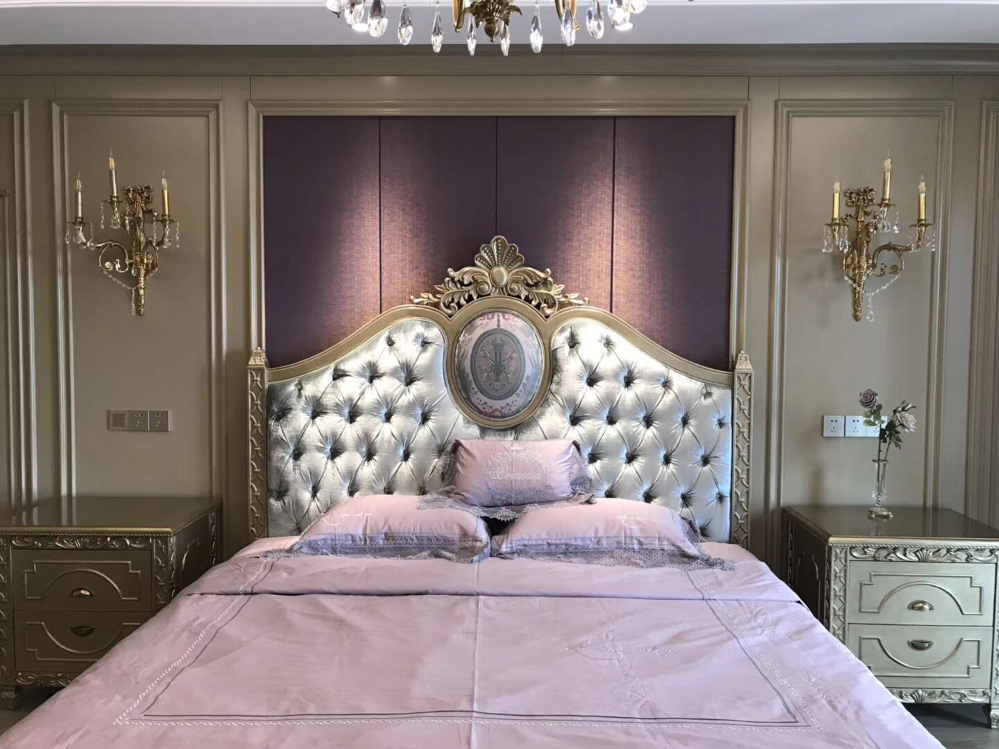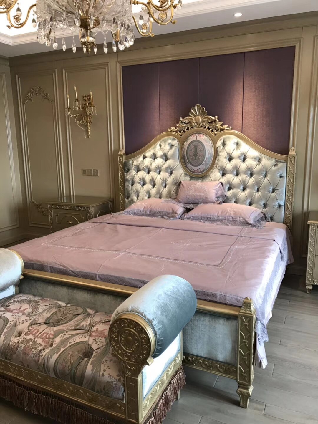 Golden Bed Head Cabinet Dark Blue Bed Gold Makeup Bench Gold Makeup Mirror Purple Makeup Stool