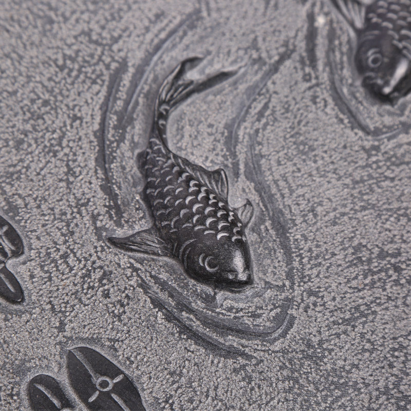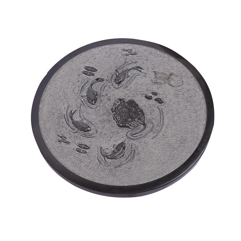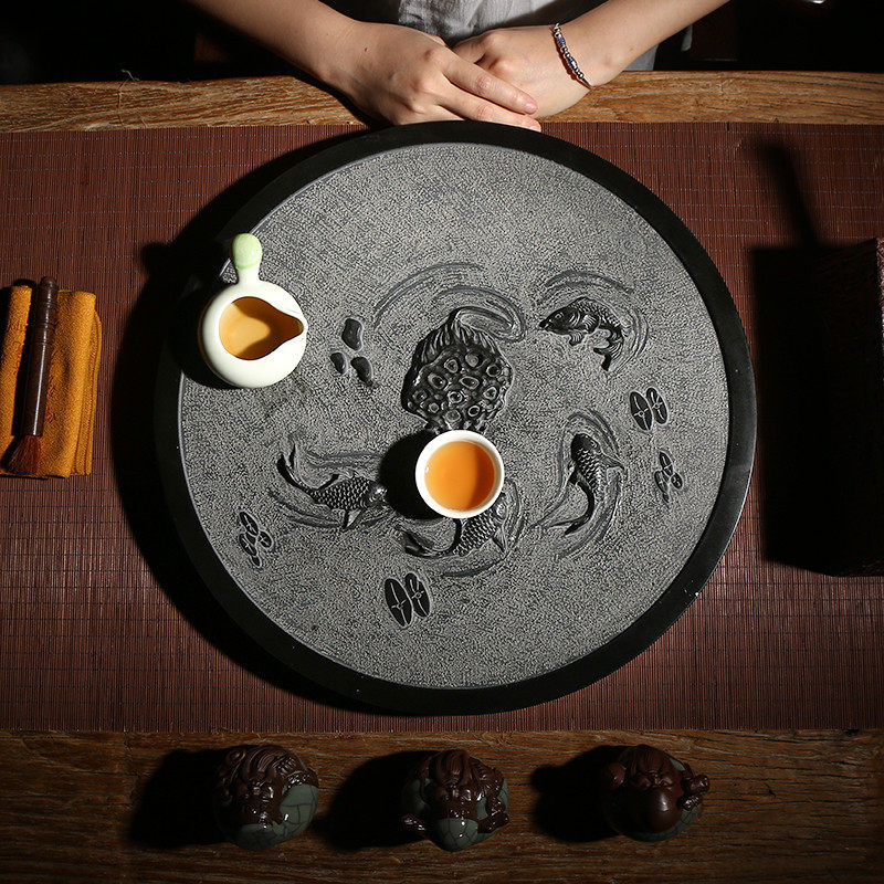 Embossed tea tray whole piece of black stone tea tray handmade classical round tea tray household tea tray like a fish in water