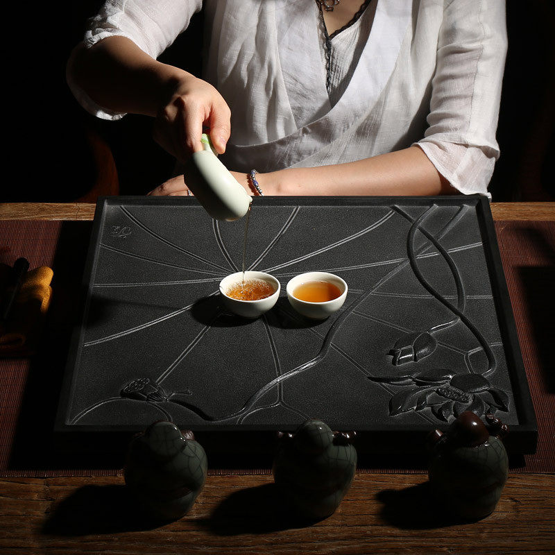 Natural black gold stone tea tray whole stone tea table home small tea tray kung fu tea set drainage tray stone