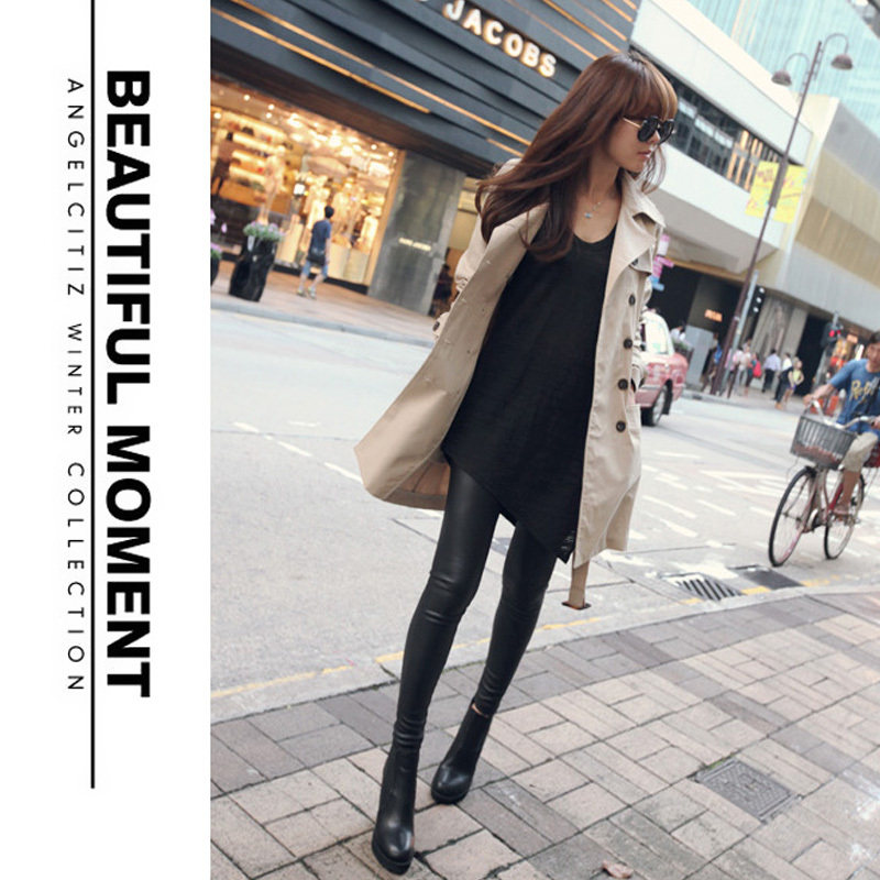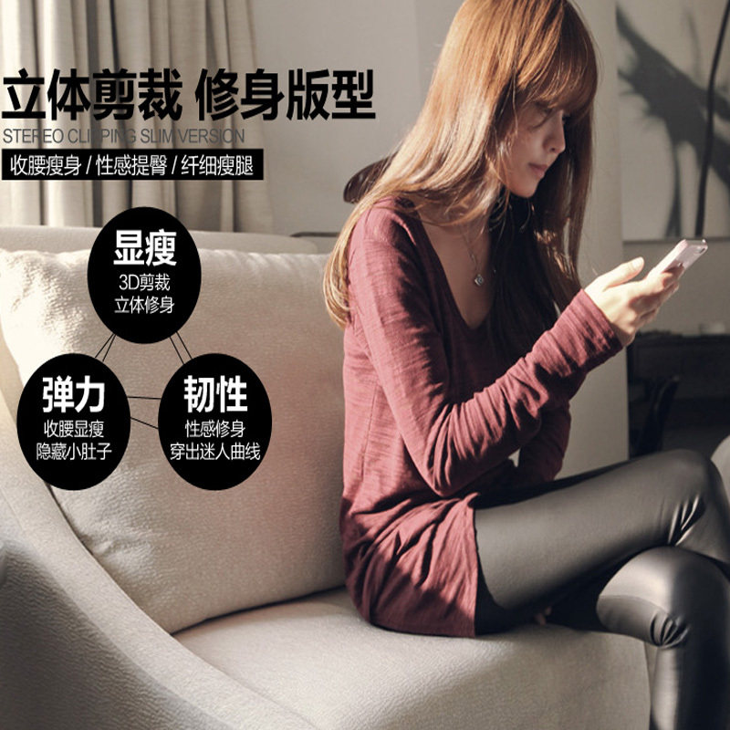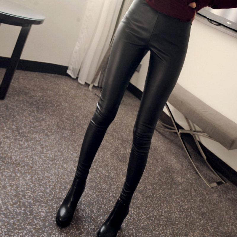 Long pants high waist tight fabric imitation leather pants wear thin bright glossy underwear slim women's pants Black