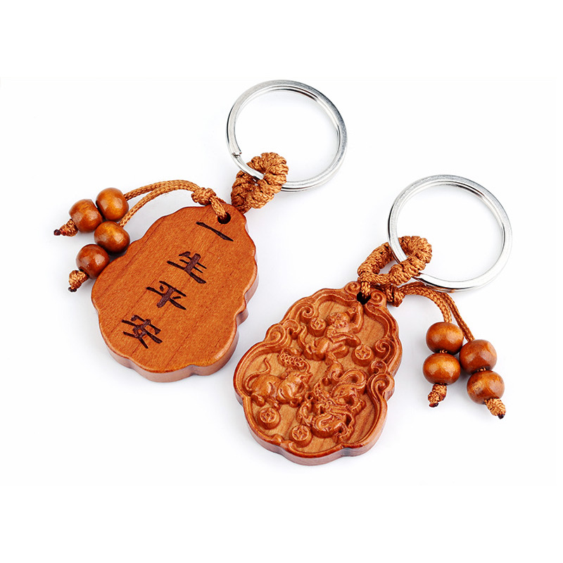 Juyuan Pavilion wood carving peach wood zodiac three-in-one keychain pendant Pig sheep Rabbit safety car keychain ring Men and women