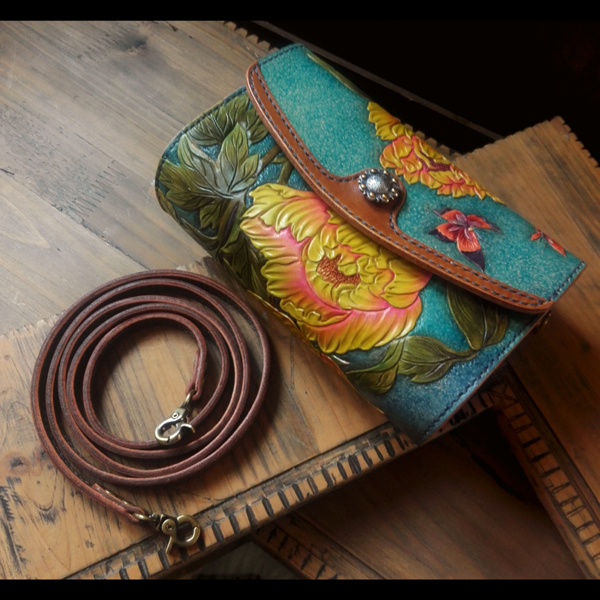 Handmade leather men's bags and women's bags custom-made cowhide carved and painted peony women's oblique cross-hand storage bag