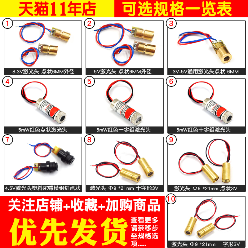 3.3V Laser Head Dot 6MM O.D. (2pcs) 5V Laser Head Dot-shaped 6MM O.D. (2pcs) 3V-5V Universal Laser Head Dot 6MM OD (2pcs) 5mW Red Dot Laser Head (1pcs) 5mW Red Cross Laser Head (1pcs) 4.5V Laser Head Plastic Gyro Module Red Dot (2pcs) Laser Head Φ9 *21mm Cross-Shaped 3V(1pcs) Laser Head Φ9*21mm Dot-shaped 3V(1pcs) Laser Head Φ9* 21mm Zigzag 3V (1pcs) 5mW 650nm Laser Tube (1pcs) 6mm Internal Adjustment 3-foot Laser Tube 650nm 5mw 2.2-3V Red Dot (1pcs)