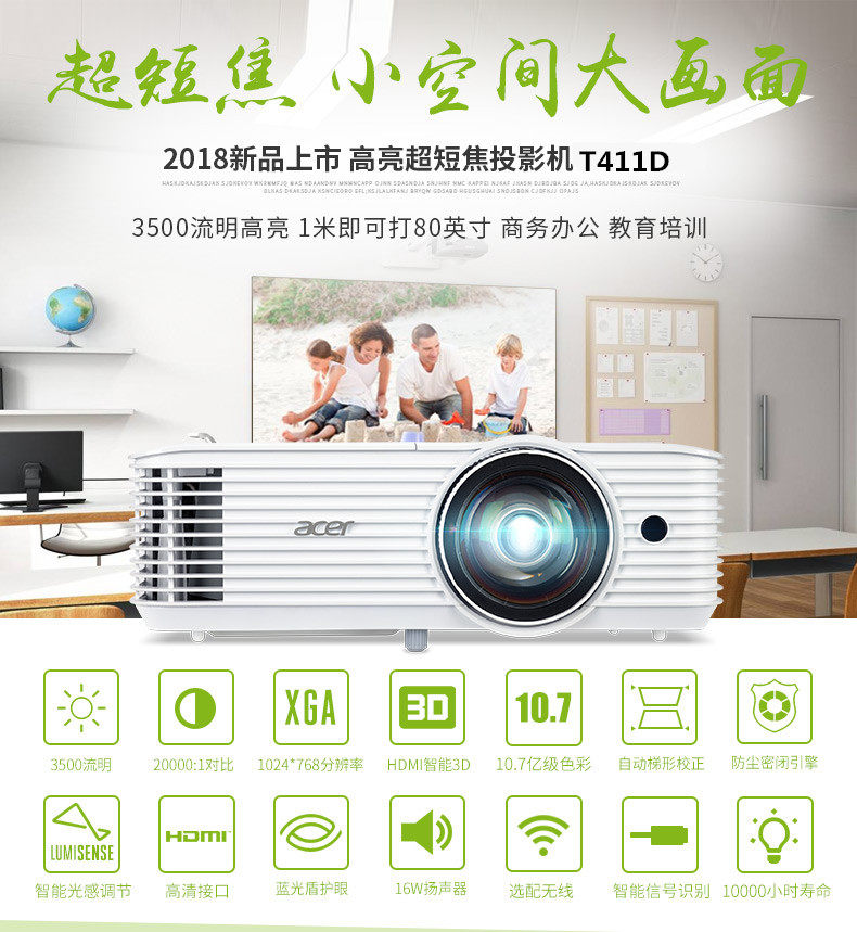 Acer macro-based T411D short coke projector Business teaching training T421D Near-focus distance high-definition entertainment machine