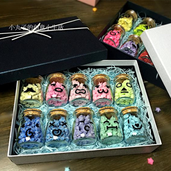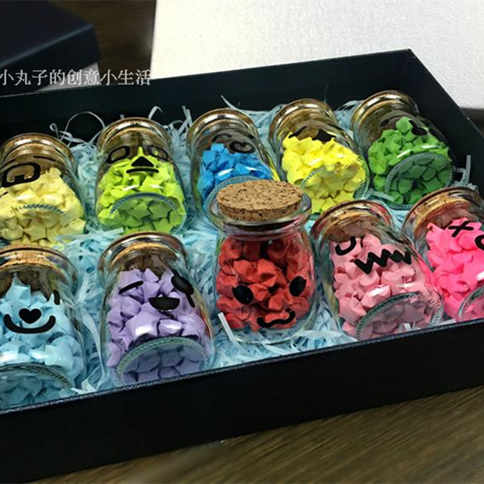 Only 10 emoji bottles (without any) (empty) 10 bottles + gift box gift bag (material) solid color origami + 10 bottles + box bag (material) luminous origami + 10 bottles + box bag (material) flash brick origami + 10 bottles + box bag (finished product) solid color star + 10 bottles + box bag (finished product) luminous star + 10 bottles + box bag (finished product) shining brick star + 10 bottles + box bag