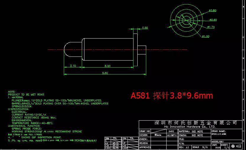 A581 factory direct sales of high-quality environmental protection spring needle probe telescopic thimble charging contact pin
