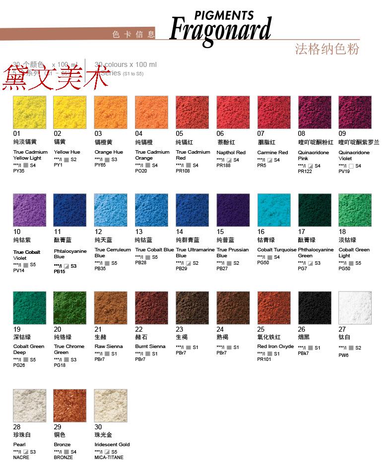 28#珍珠白27#钛白26#烟黑25#氧化铁红24#熟褐23#生褐22#赭石21#生赭17#酞菁绿15#纯普蓝14#纯羣 it's a