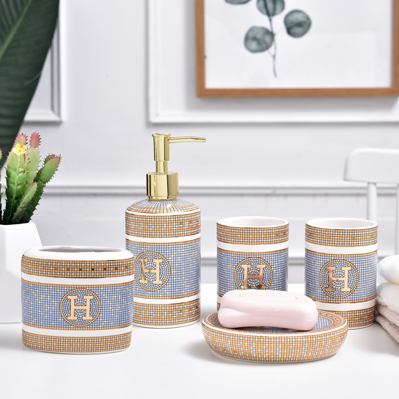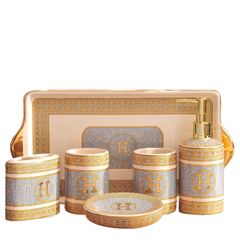 Five-piece set (H beige)Six-piece set (H beige)Lotion bottle Six-piece set (with handle)Single cup tray Five-piece set (H white)Soap dish Toothbrush holder Six-piece set (H white)Three-piece set Five-piece set