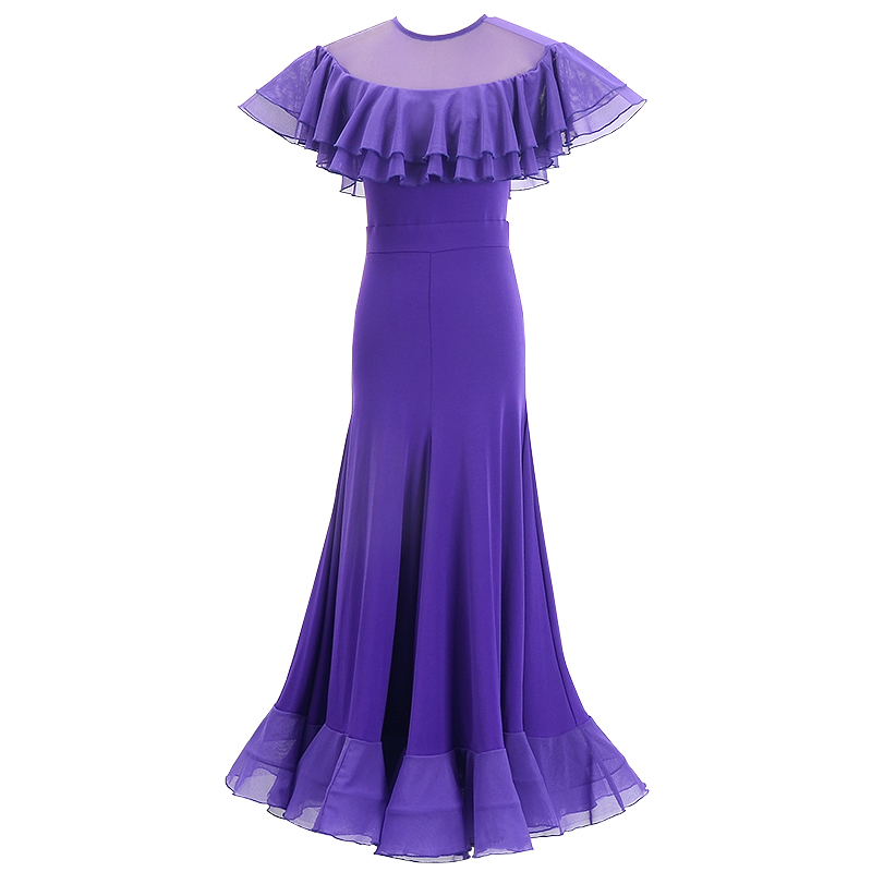 Modern dance dress ballroom dance through net round neck short lotus leaf sleeve big swing dress national standard dance waltz practice dress
