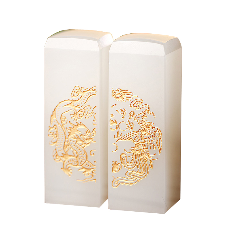 Jade lettering lovers seal a pair of boutique natural white jade dragon Feng combined with calligraphy and painting Yin and Yang Zhang