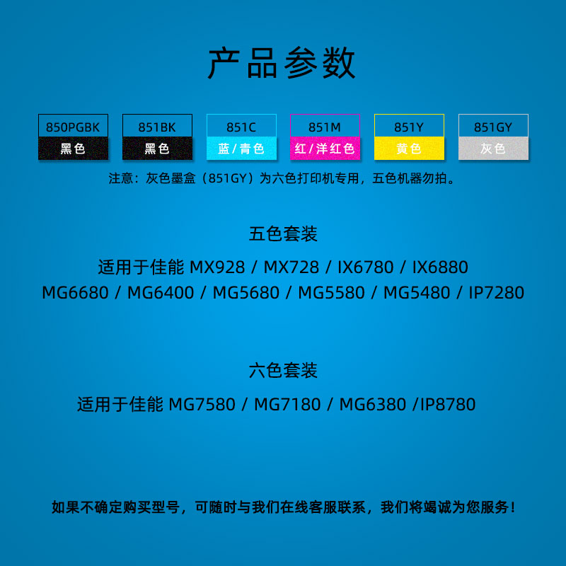 850BK (big black) 851BK (photo black) 851C (blue) 851M (red) 851Y (yellow) 851GY (gray five colors