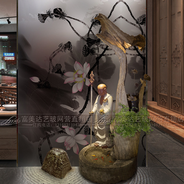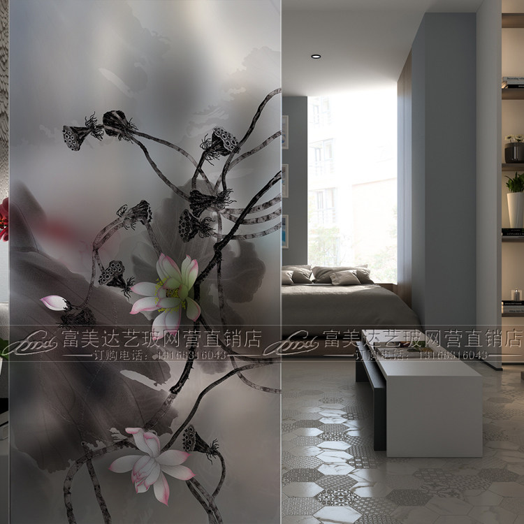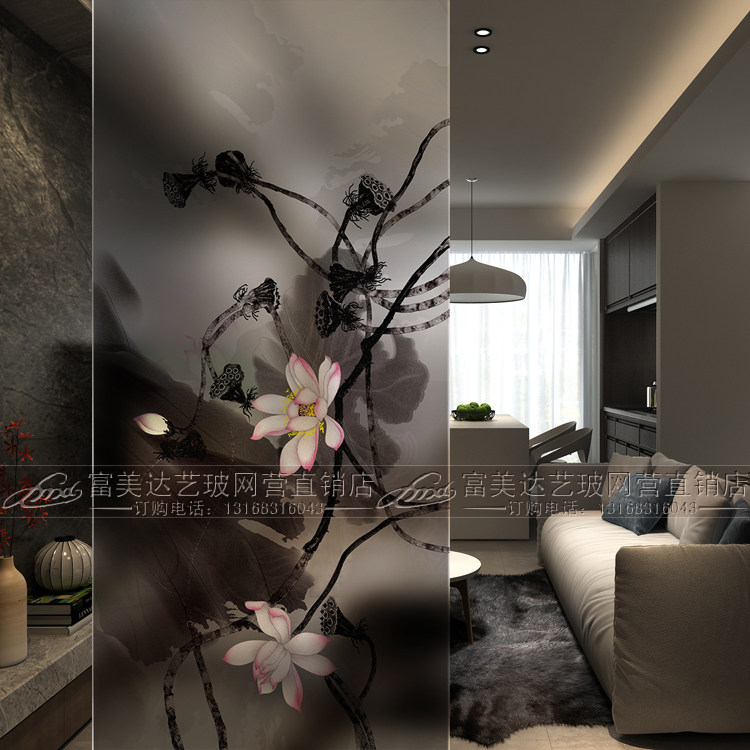 Modern Art Glass Partition Screen Living Room Light Transmission Steel Frosted Shoes Cabinet Process Glass Chinese Ink Lotus Flowers