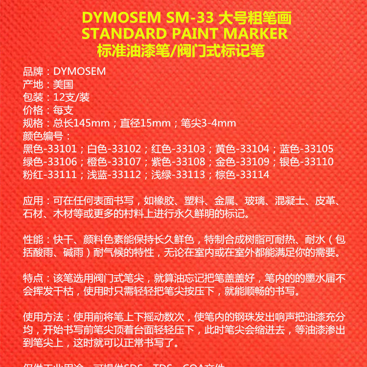 American imported Dymosem standard paint pen SM-33 valve type marker Oil waterproof, sun resistant and heat resistant