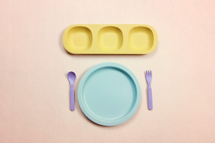Pink base yellow plate yellow fork spoon yellow base purple plate purple fork spoon pink base purple plate purple fork spoon pink base green plate green fork spoon pink base bean blue plate purple fork spoon