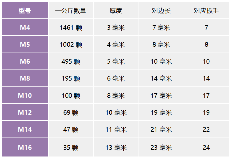 M4 one kilogram (about 1461 pieces) M5 one kilogram (about 1002 pieces) M6 one kilogram (about 495 pieces) M8 one kilogram (about 195 pieces) M10 one kilogram