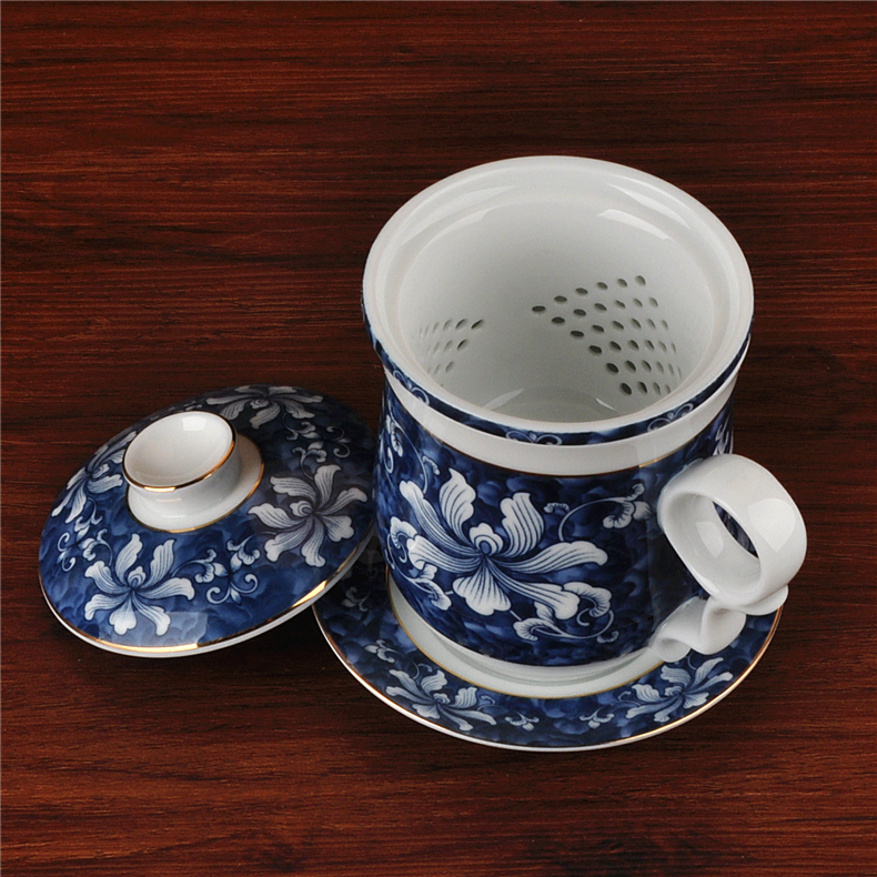 Ceramic teacup with lid Filter tea cup Bone China office cup Blue and white porcelain water cup Four-piece set gift