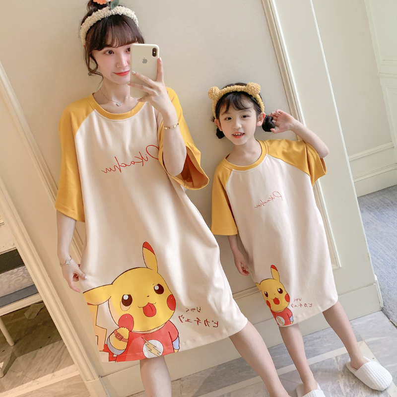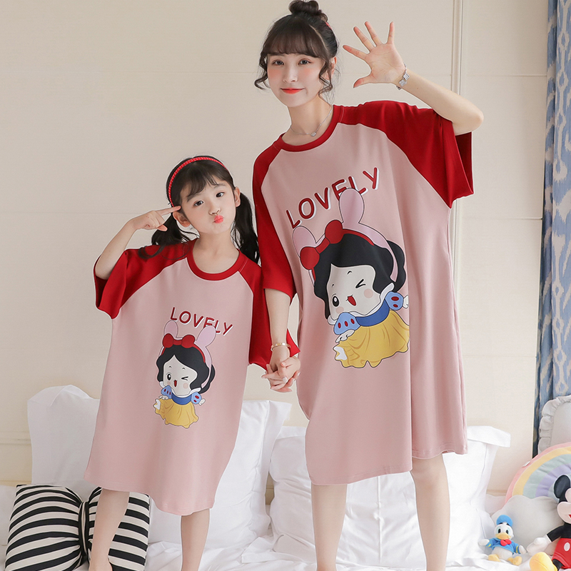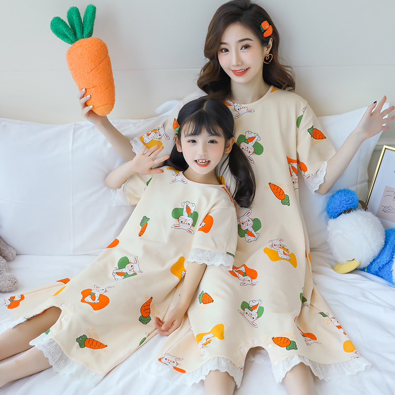 Summer day mother and daughter children's night dress girls princess style thin cotton large and small children parent-child baby pajamas dress