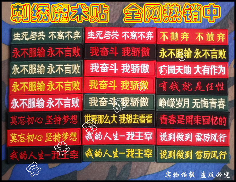Don't give up Don't give up (yellow on a red background) The world is so big (yellow on a black background) Life and death together (white on a red background) I struggle I am proud (yellow on a red background) Never say die (Yellow on a black background) Life and death (Yellow on a green background) Glory years (Green on soil) Vast world (white on red) My life (white on a red background) My life (red on a black background) My life (yellow on a green background) I struggle I am proud (green on white) I struggle I am proud (white on a red background) I struggle I am proud (red on a black background) rich is willful (red on a black background) Youth is used to remember (red on a black background) Don't forget your original heart (yellow on a red background) Don't forget your original heart (red on a black background) Do what you say (yellow on a green background) Do what you say (white on a red background) Never say die (Red on a red background) Never say die (white on a red background) Never say die (White on a red background) Never say die (Yellow on a red background)