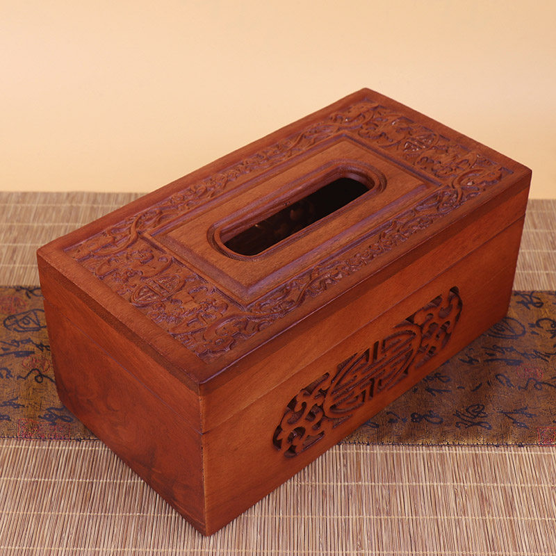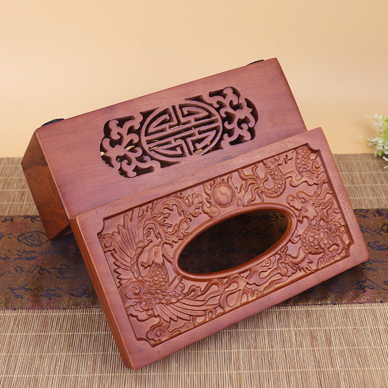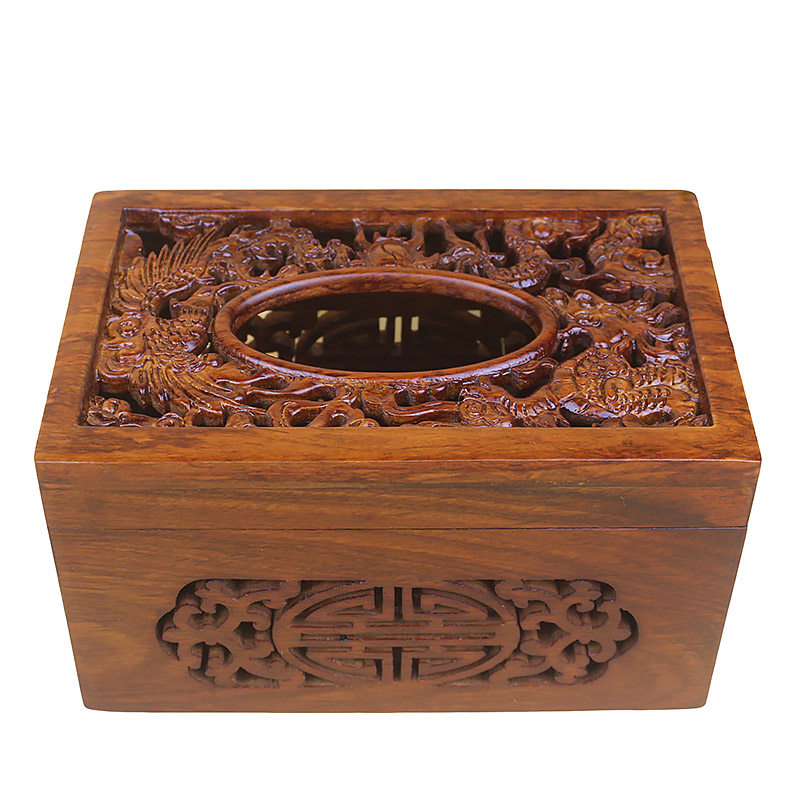 Solid wood tissue box Chinese classical carving dragon and phoenix open lid square dining paper box toilet paper box hollow antique paper tube
