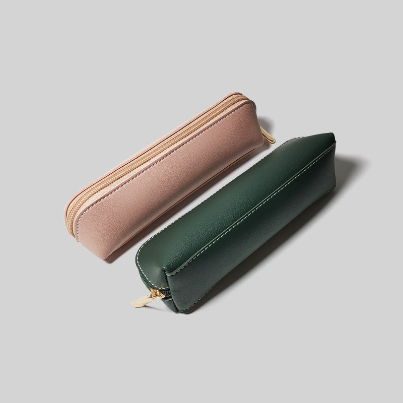Minimalist pure color fine lychee print double-sided leather pu pencil case male and female student steamed buns family large capacity pen bag