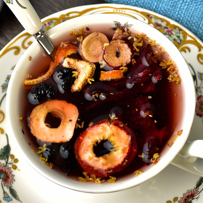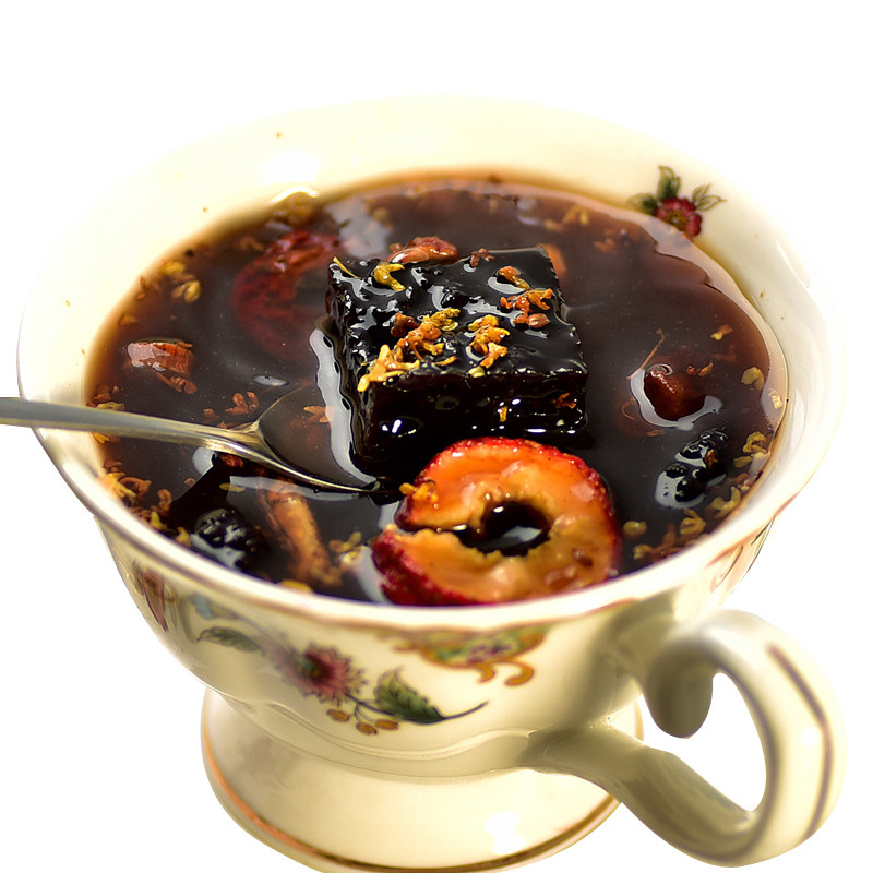 Red dates, roselle, ebony, licorice, mulberries, dried tangerine peel, hawthorn, dried ginger, sucrose, sweet-scented osmanthus