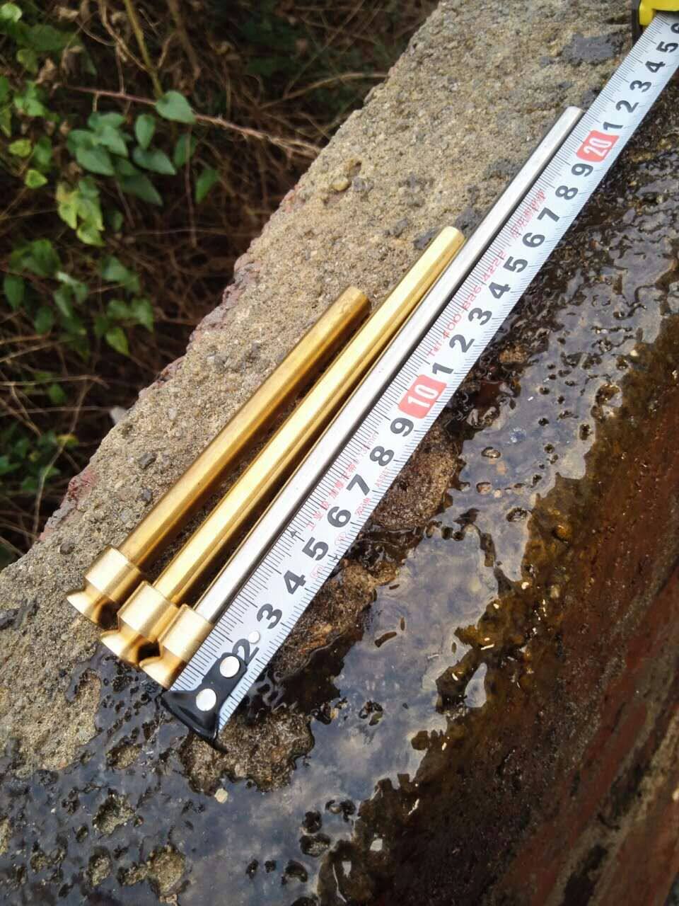 The copper pipe is about 12 cm long. The copper pipe is extended by 15 to 20 cm. The stainless steel pipe is 15 to 20 cm long. The stainless steel pipe is extended by 30 cm. The copper pipe is extended by 23 cm.