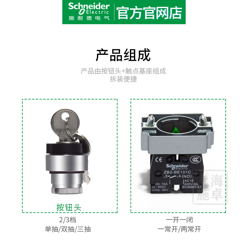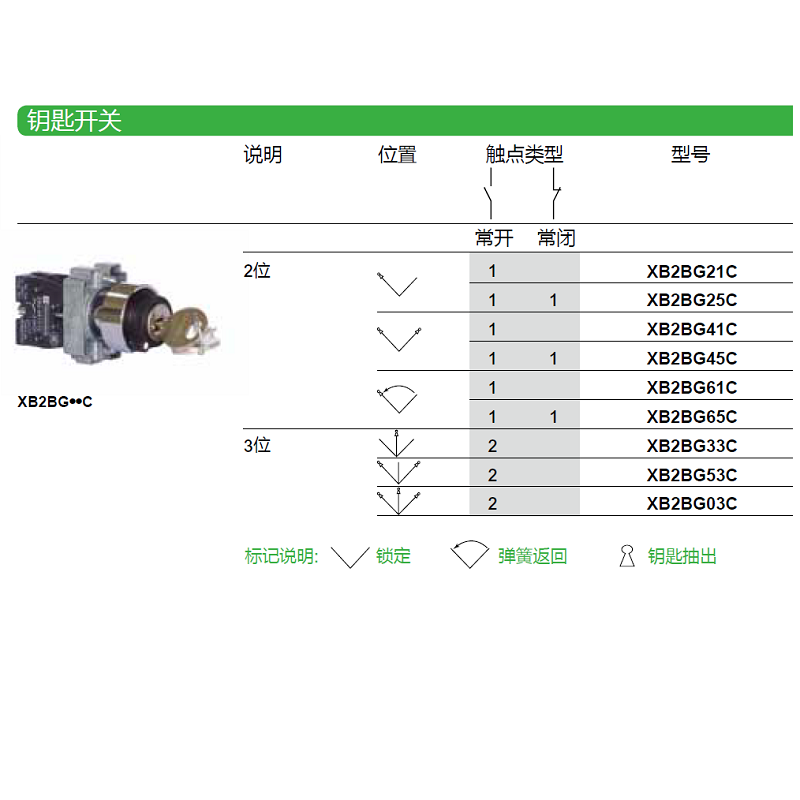 XB2BG21C ]2 Self-lock Key left side can be pulled 1 frequently open XB2BG25C / 2 lock 2 lock keys on the left side of the key can be plugged 1 open 1 closed XB2BG41C / 2 files