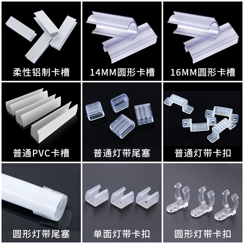 Round light strip card slot (20pcs / pack) Flexible aluminum card slot (10pcs / pack) Round light strip tail plug (20pcs / pack) Ordinary light strip clip (20pcs / pack) Ordinary light strip