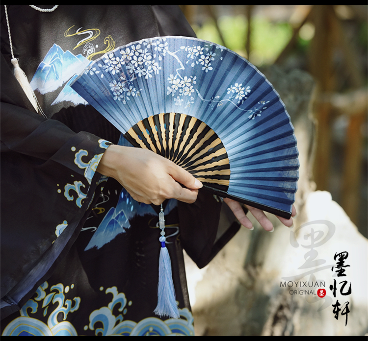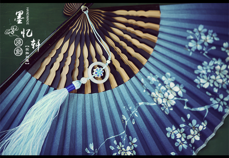 Mo Yi Xuan exclusive "flower words" original ancient style blue cherry blossom cloisonne Agate cloth bamboo fan birthday gift