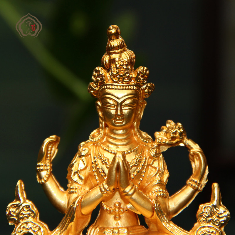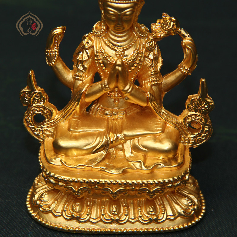 Buddhist supplies Four-armed Guanyin Alloy Small Buddha statue Gilt Buddha statue 8 cm high Tie price