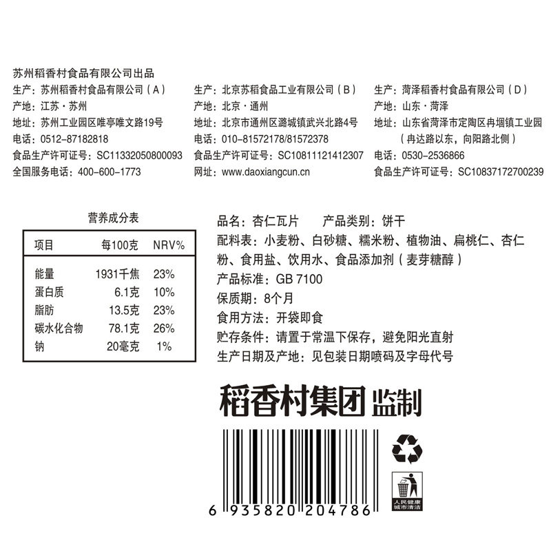 Rice fragrant village Sesame Tiles Almond Tiles Rice Fragrant Village Sesame Thin Crispy Cake Beijing Snack of the Sesame Seeds