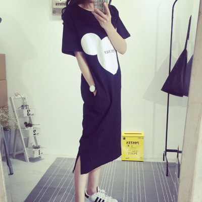 Pregnancy Woman Dress Korean Version Summer Cartoon Printed Open Fork Long Version Loose Pregnant Woman Foreign Dress Woman T-Shirt Long Skirt Woman
