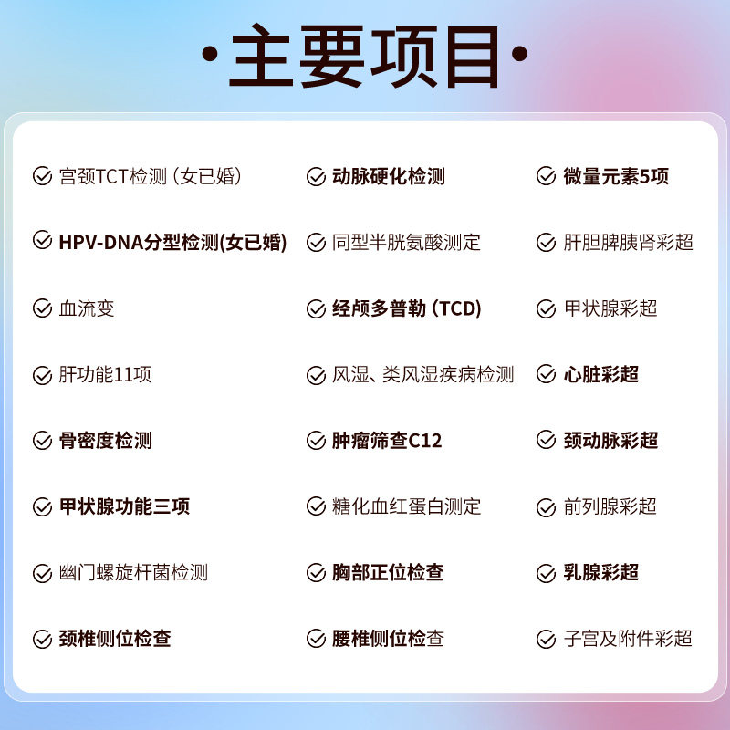 The outer eye,Triglycerides (TG) Low Density Lipoprotein Cholesterol (LDL-C) HDL cholesterol (HDL-C) Total cholesterol (TC),Glycated hemoglobin on fasting blood glucose,Creatinine (Cr) uric acid (Ua),The lateral position of the cervical spine,The teeth are,The color of the breast is super,Cancer antigen 242 (CA242) cancer antigen 19-9 (CA19-9) Neuron-specific enolase (NSE) carcinoembryonic antigen (qualitative) cancer antigen 72,Breast skin superficial lymph nodes (neck collarbone upper axillary groin grotto) Ridge Column Anal External Genitalia Extremities Thyroid (Surgery),The abdominal touchdown lung listens to the consultation in the heart of the clinic,Vision of the eye, the eye of the eye.,An electrocardiogram,Stomach protease original II (PGII) Gastroproteinogenic I (PGI) PGI PGII ratio,Shallow table lymph nodes (neck collarbone upper axillary groin) Cutaneous Anal Thyroid (Surgery) Crest Column Prostate (Surgery) Breast Extremities,The chest is just in position.,Urea nitrogen (BUN) in the form of a,Bone density detection (ultrasound figures),Neutral Grain Cell Absolute Value Average Platelet Volume Neutral Granulocyte Percent Platelet Distribution Width Red Blood Cell Count Red Blood Cell Distribution Width-Standard Deviation Lymphocytes % ,The color of the carotid artery.,Blood plasma viscosity in the blood of the blood,Lower limb constriction press diaspelin pressure and pressure,White belt routine for the white band,Nasal Outer Ear Canal Tympanum Opharyngeal Nasal Septum,The transcranial Doppler is a,Liver and spleen pancreatic kidney in the liver,The colour of the prostate is super,Body weight in body shape,Uric acid pH urine Urine Biliary Urine Urine Metauria Nitrite Urine Cryptic Blood Biliary Red Vegan Urine Color Urine acid pH Urine Biliary Red,It's the heart color super -,Cervical HPV-DNA Check in the Cervical HPV,Cervical TCT,Helicobacter pylori antibodies (Hp-Ab),Copper-magnesium-zinc calcium iron in copper and iron,The class of rheumatic factors,The uterus accessories color the color of the,Waist-to-hip Ratio Waist Circumference Pulse Blood Pressure Body Mass Index Height Hip Circumference,The cleft of the rift light is checked,The color of the thyroid is super,Hypersensitivity C reactive protein in a way that can be,The lumbar side of the lumbar position DR,Direct bilirubin total bilirubin (TBIL) Total protein globulin alanine aminotransferase (ALT) indirect bilirubin alkaline phosphatase (ALP) albumin ,The amount of lung activity (VC),Total Saniodothyroidism (T3) Total thyroxine (T4) Thyroxine (TSH),Hydroxybutyrate (a-HBDH) phosphocreatonic acid kinase isoenzyme (CK-MB lactate dehydrogenase (LDH),The vagina.