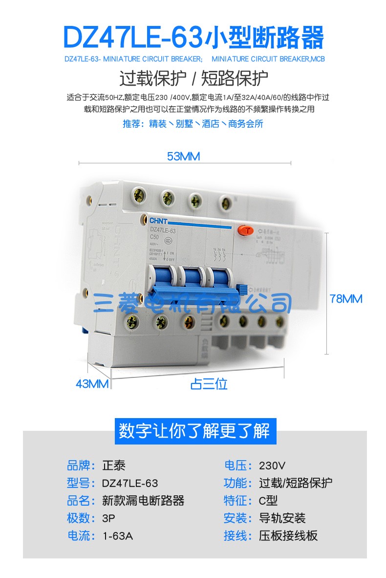 Chongguan CHNT Zhengtai air switch with leakage protector switch leakage protection circuit breaker DZ47LE 3P