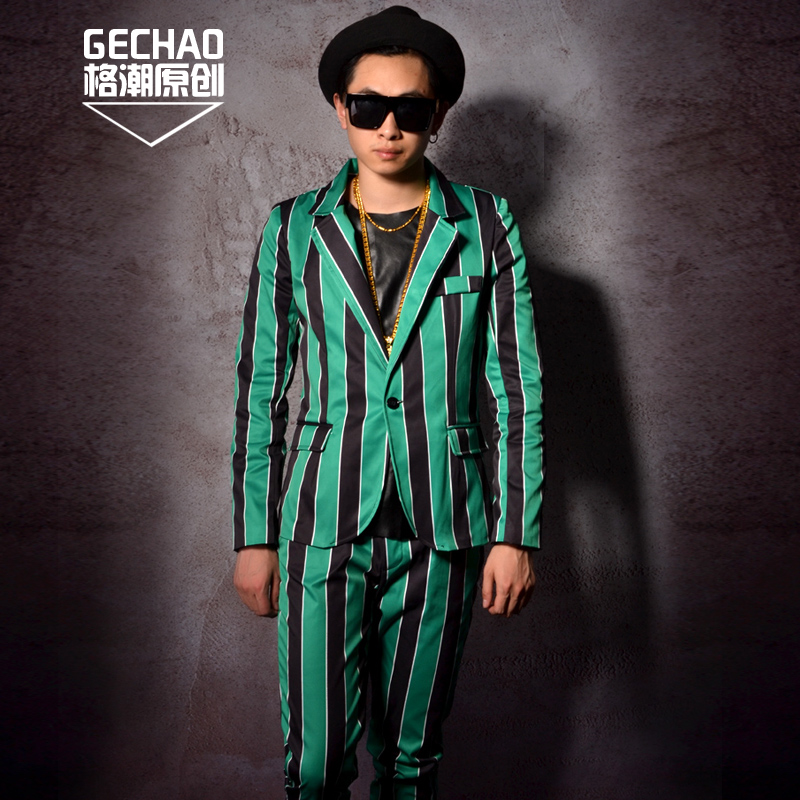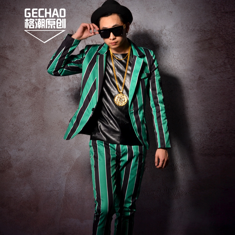 Green and black striped British suit, hairdresser, star nightclub bar singer DJDS performance costume