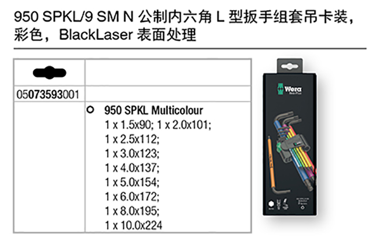 German Wera Villa 950 SPKL 9 1.5-10mm Color L-Lengthened Hex Wrench 073593
