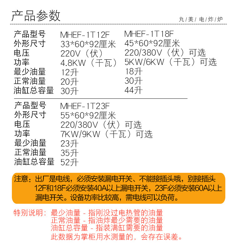12F electric fryer 220 volts 4.8 kW 12F electric fryer 380 volts 4.8 kW 18F electric fryer 220 volts 5 kW 18F electric fryer 220 volts 6 kW 18F electric fryer 380 volts 5 kW 18F electric fryer 380 volts 6 kW 23F electric fryer 220 volts 7 kW 23F electric fryer 380 volts 7 kW 23F electric fryer 220 volts 9 kW 23F electric fryer 380 volts 9 kW