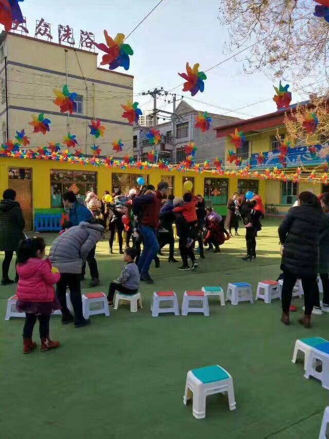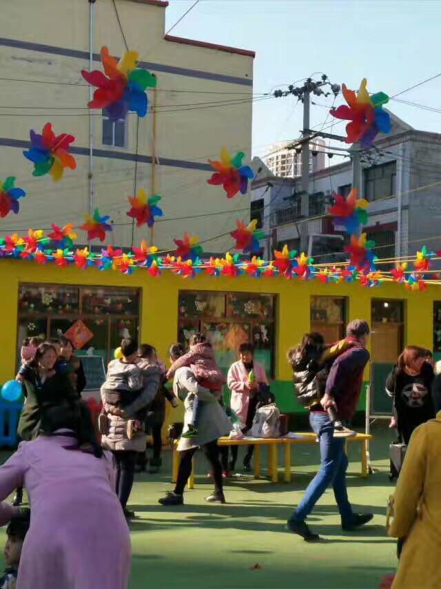 Kindergarten playground is decorated with colorful windmills in front of supermarket mall door - decorated windmill