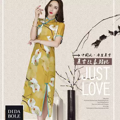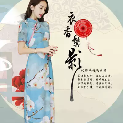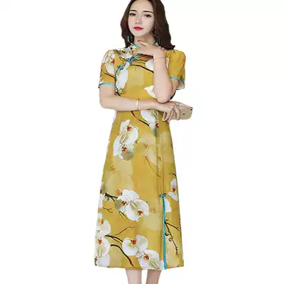 Chinese style celebrity temperament cheongsam skirt 2019 summer new female slim print medium and long version split dress