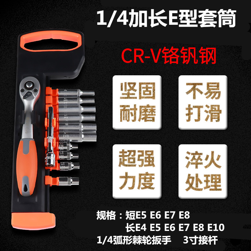 1 4 Short E-Sleeve E41 4 Short E-Socket E51 4 Short E-Socket E61 4 Short E-Socket E71 4 Short E-Socket E81 4 Extended E-Socket E41 4 Extended E-Sleeve E51 4 Extended E-Socket E61 4 Extended E-Socket E61 4 Extended E-Socket E71 4 Extended E-Socket E81 4 Extended E-Socket E81 4 Extended E-Socket E1012 Pieces 1 4E Socket (Long + Short With Wrench) 10 Piece Sleeve 1 4E Socket Sleeve (Long + Short) 6 Piece Set 1 4 Extended E-Socket Yellow Black Handle 1 4 Fast Ratchet Wrench 1 4 screw handles