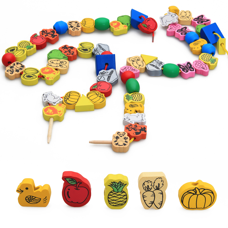 Wooden 2-3-4 Year Old Children Building Blocks Puzzle Animal Fruit Love Boxes String Beads Through Rope Threading Game Toys