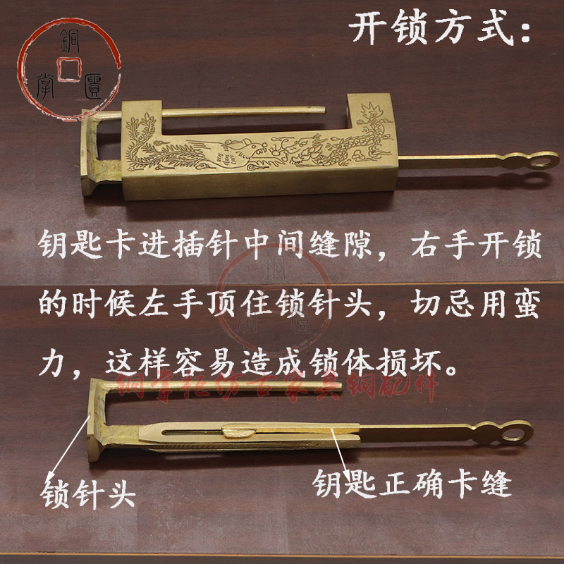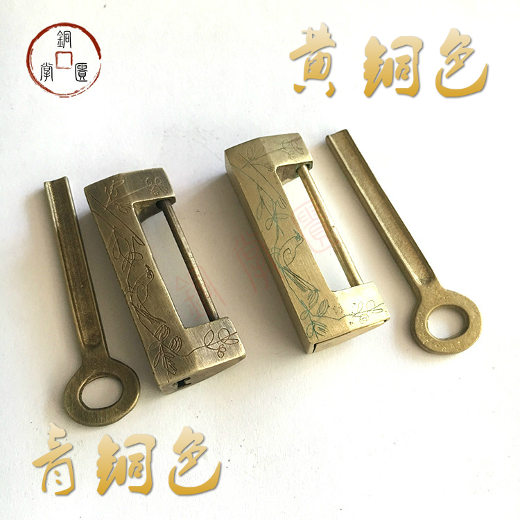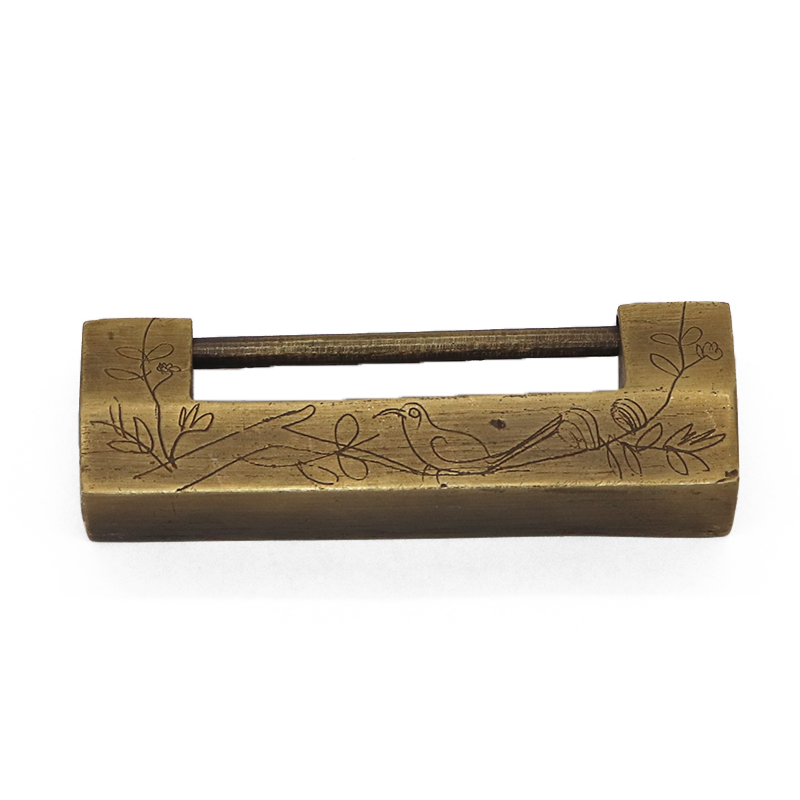 Copper lock Chinese antique lock retro engraved pure copper ancient horizontal bolt lock horizontal open padlock old-fashioned small key lock