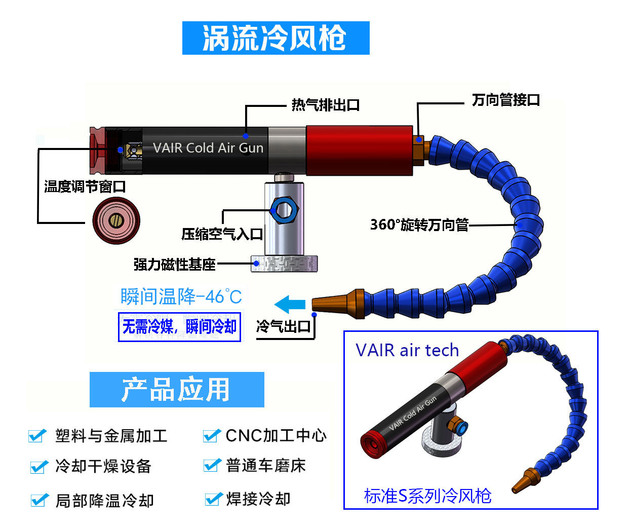 VAIR Standard S Series Eddy Current Pipe Cold Air Gun Stainless Steel Cold Air Gun Engraving Machine Cutting Process Cooling Gun