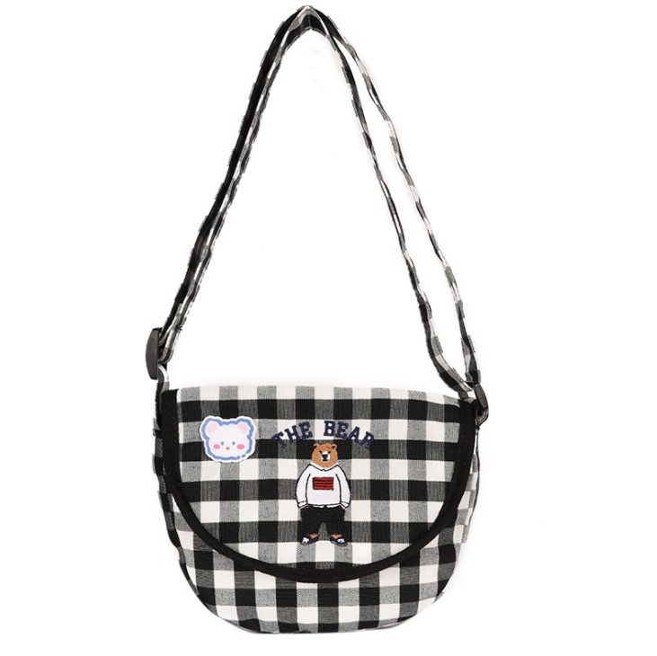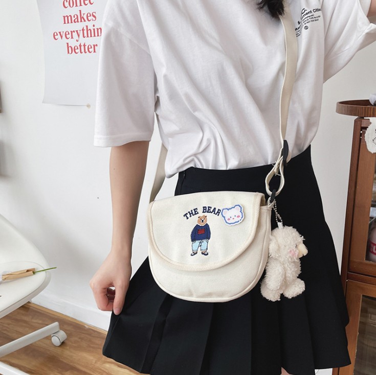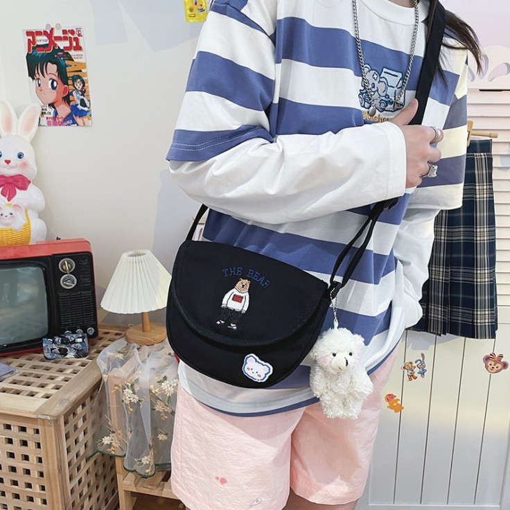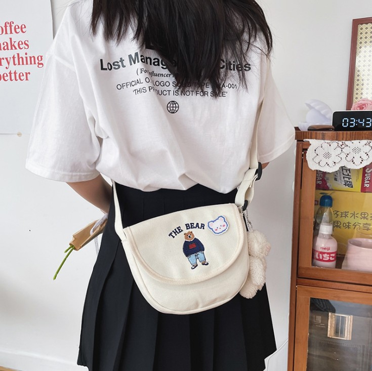 The Japanese Ins are ancient with a sense of personality Embroidery Little Bear Soft Girl student Canvas Slanted Satchel Cute Little Bag Girl