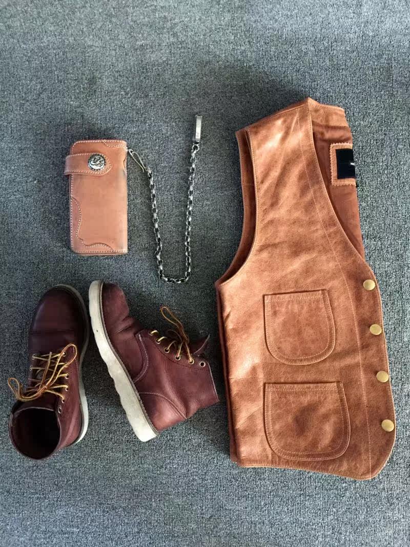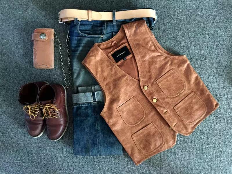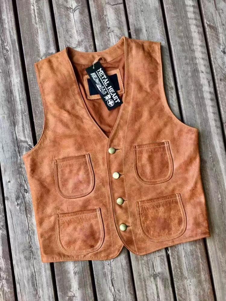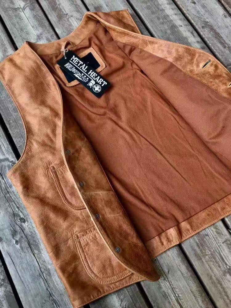METAL HEART Retro Leather Vest Retro Click Style Oil Wax Leather Vest