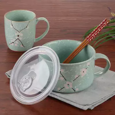 Yatai Japanese-style household bento box with lid Lunch box Snowflake porcelain large fresh-keeping bowl Instant noodles cup Water cup set Free chopsticks