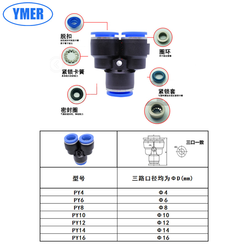 Pneumatic element Y type tee PY-14 16 Y type pneumatic element Y type tee