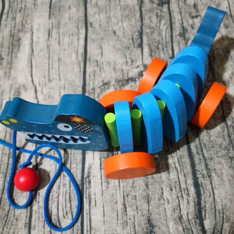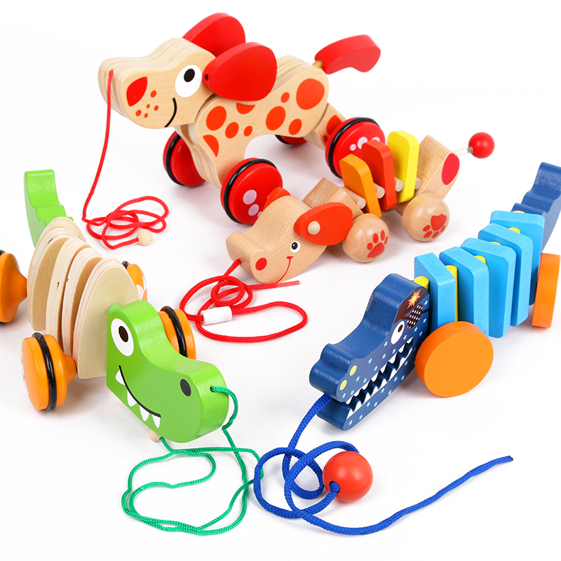Baby Boy Wooden Tug Pull Toy Pull Cord Pull Rope Puppies Schoolbus male and female Children's Park Baby 1-2-3 years old