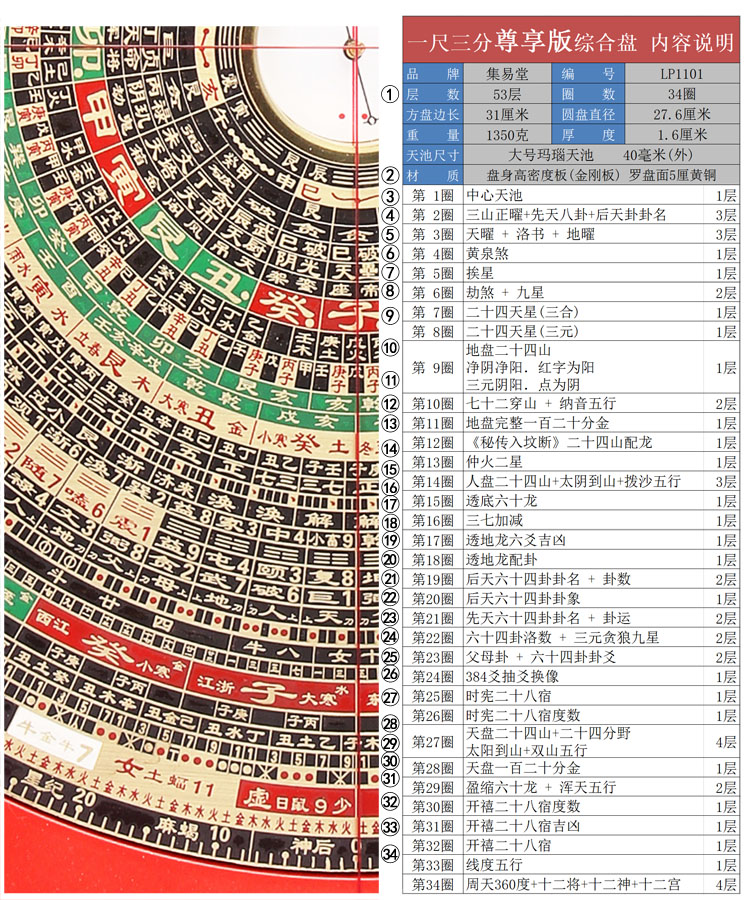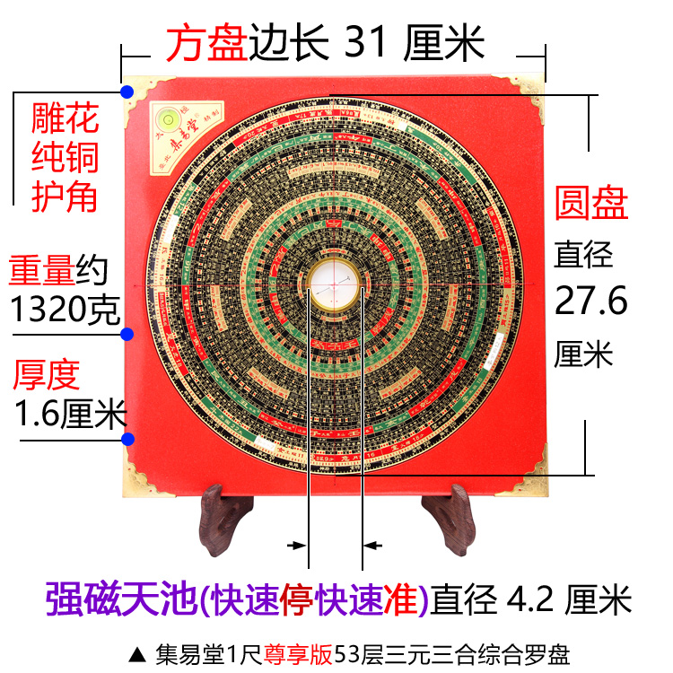 Jiyitang exclusive edition 1 foot 3 minutes 53 items Three yuan three-in-one integrated Feng Shui compass Strong magnetic Tianchi